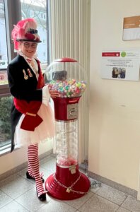 Durch die Spende der 1. Kölsche Aape-Sitzung konnte die Ambulanz der Kinderkardiologie mit Spielgeräten für die herzkranken Kinder ausgestattet werden. Ein Flummi-Automat ist eine weitere neue Besonderheit in der Ambulanz. Hier dürfen sich die Kinder nach der Behandlung mit einer Münze einen Flummi ziehen. Mit Plüschtieren und Süßigkeiten für die Kinder im Gepäck sorgten die drei Besucher abermals für viel Freude.