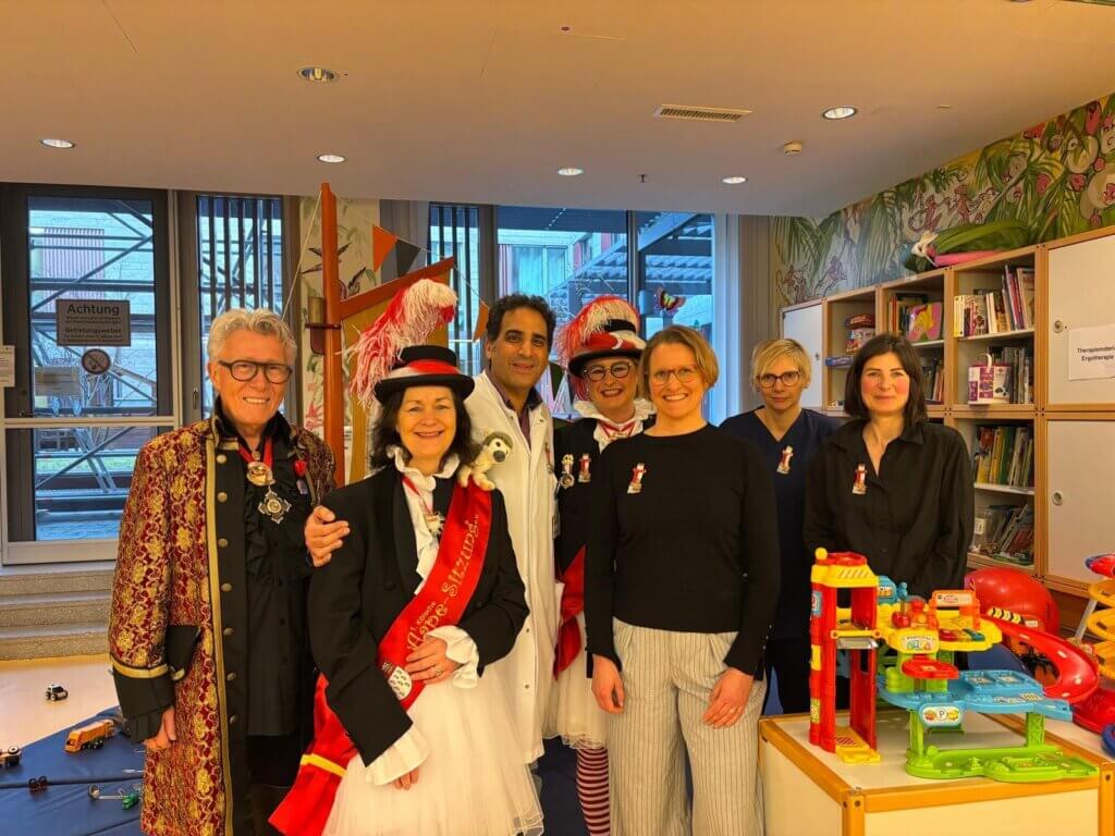Frau Weber, Präsidentin und 1. Vorsitzende des Vereins 1. Kölsche Aape-Sitzung e.V. war gemeinsam mit Anke Blaeser und Peter Schmitz-Hellwig zu Besuch im Herzzentrum der Uniklinik Köln. Empfangen wurden sie von Herrn Professor Dr. Markus Khalil, Frau Dr. Jennifer Kramp, Frau Sarah Haubeck und Frau Larissa Zecha.